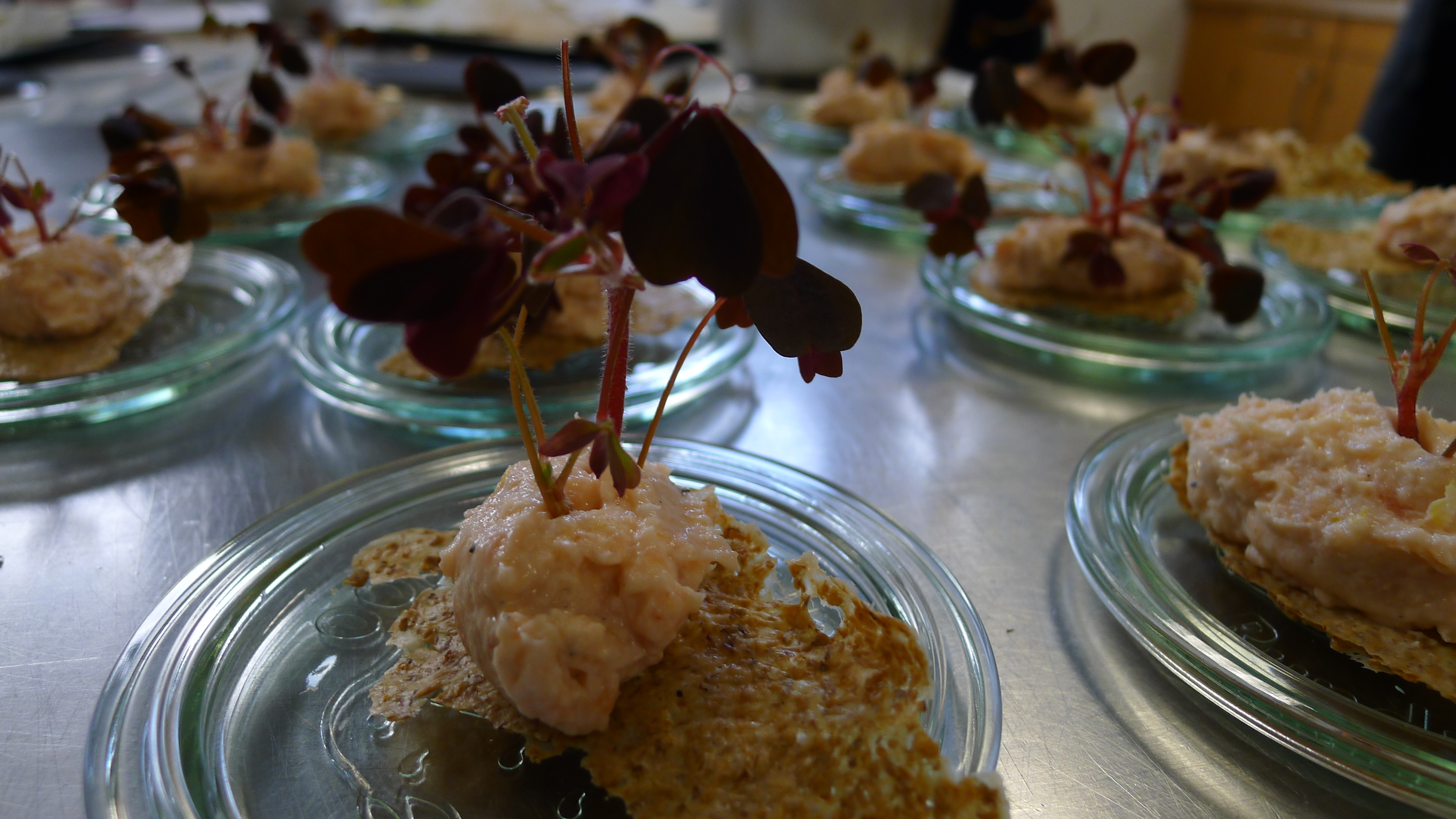 Snack (sprød havreflage, røget laksemousse, stenbiderrogn, skovsyre)