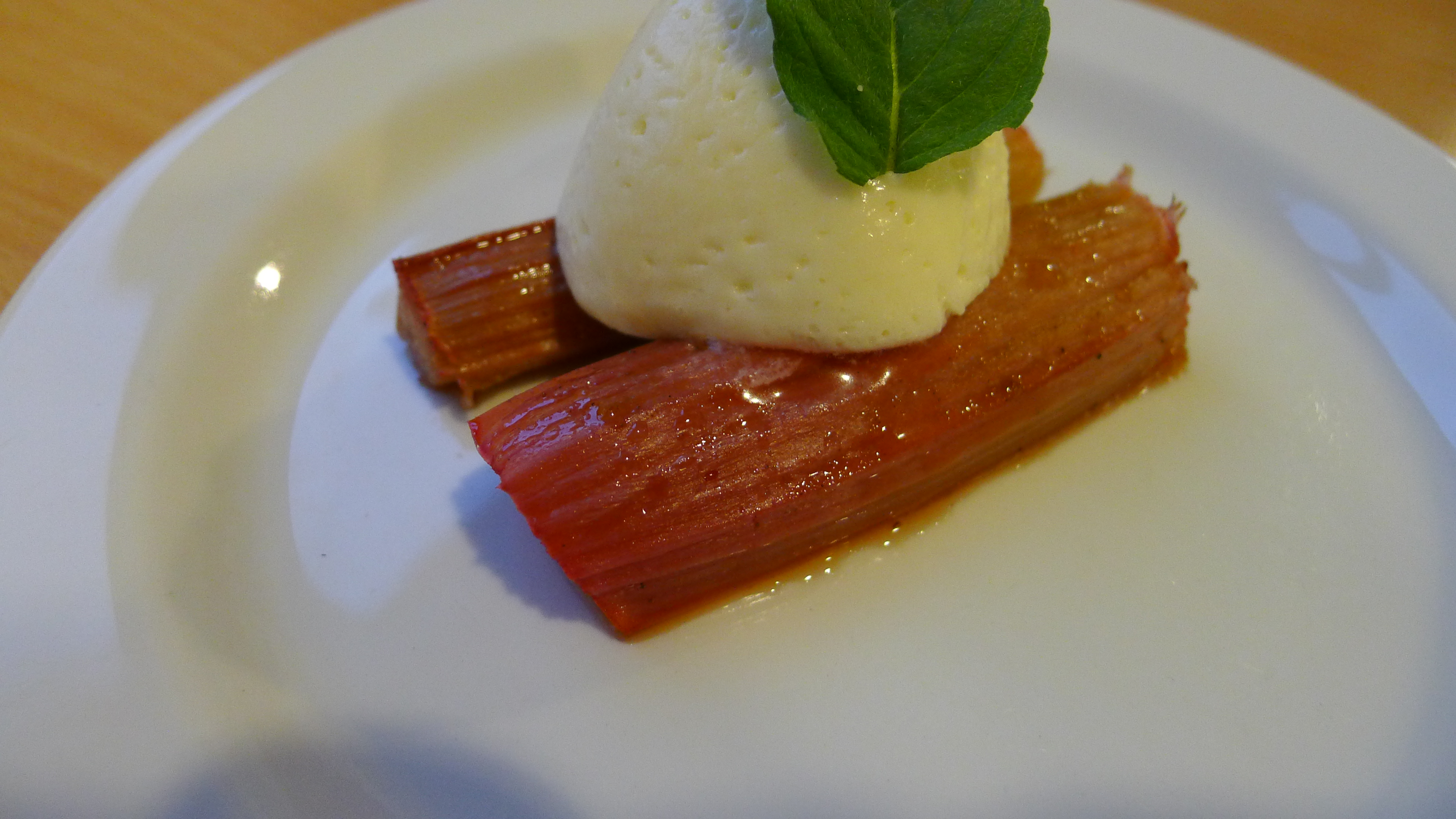 Rabarberne anrettes nu med den hvide chokomousse og frisk mynte.