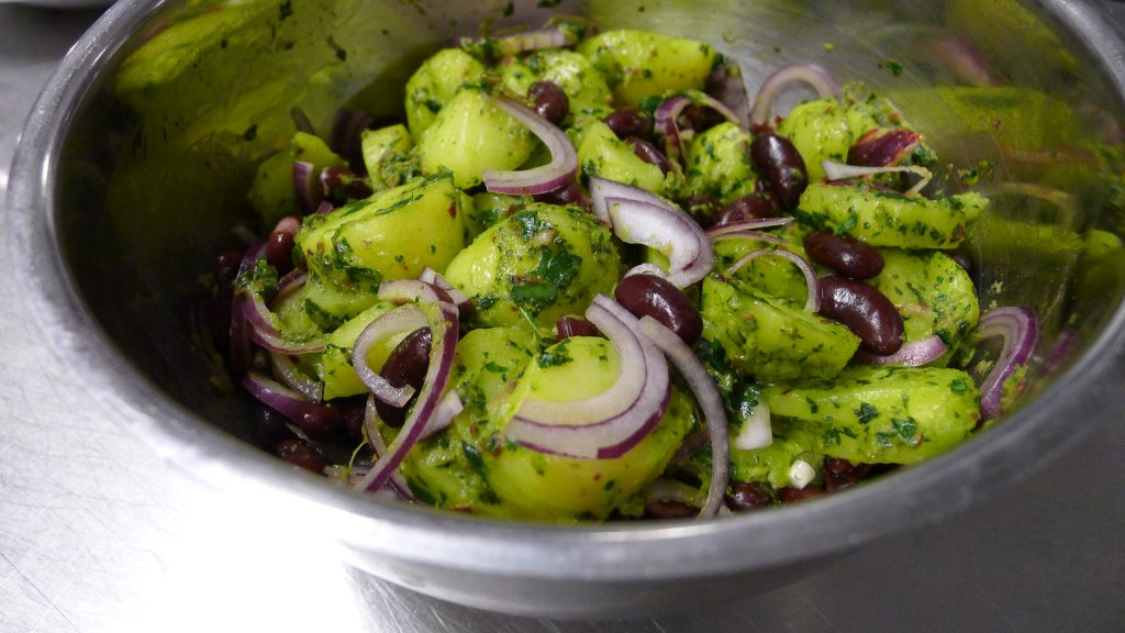 - Bland bønnerne, og de snittet rødløg i kartoffelsalaten.