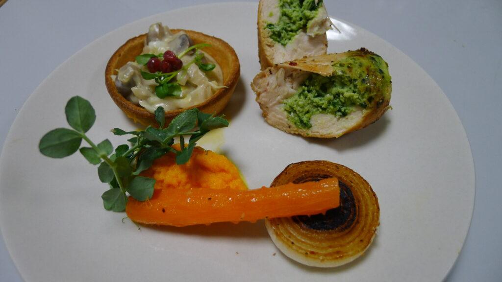Rulles op i film som flotte balotiner. Bages i ovn i vandbad i ca. 130 grader i ca. 20 – 30 min.