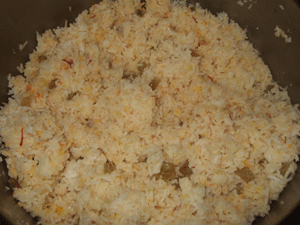 Lad risene koge i 20 min med nelliker og kardemomme. Tag gryden af varmen og tilsæt den opløste safran, og rosiner. Løg låget på risene og lade dem hvile i 5-10 min.